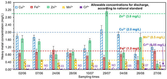After that, the remaining measurements of heavy metal concentration met the national standard. Specifically, Figure 4 presents the concentration of five representative metals (i.e., Cu, Fe, Zn, Mn, Cr) in the permeate flow of SPRO (also the outlet of the WWTP) at different sampling times during the last three months of the investigation period (i.e., from June to August 2021). They are mostly lower than the corresponding allowable concentration for discharge (dashed lines in Figure 4). Although the concentrations of Fe2+ (24/06), Cu2+ and Zn2+ (29/07), and Cr6+ (26/08) were still slightly higher than the allowable limits at some specific times, the general removal efficiency of heavy metals was considerably improved. Compared with the initial concentrations of heavy metals in the inlet flow (Table 1), they decreased sharply at the final treatment stage of WWTP (i.e., SPRO membrane system).