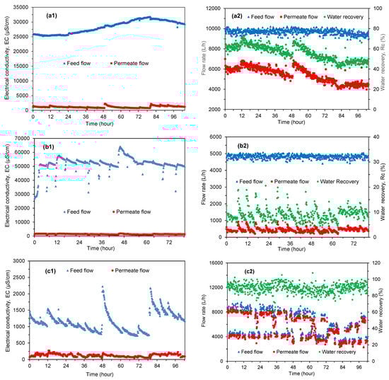 Changes in EC (a1,b1,c1) and flow rate (a2,b2,c2) with time during the operation of the PFRO (plant A), HP PFRO (plant B), and SPRO (plant C), respectively.