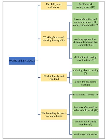 Work-life balance is a key factor in determining employees’ participation in company goals. A proper work-life balance is important not only for health and relationships, but can also improve employee productivity, and finally performance. The term ‘‘work-life balance’’ was first used in the United Kingdom in the late 1970s, and in the United States in 1986, and refers to the appropriate assignment of priorities between “work” (career and ambition) and “lifestyle” (health, pleasure, leisure, family, and spiritual development []). Work-life balance is even more of a struggle in the 21st century since many people work extended hours, have additional part-time jobs, and have family responsibilities []. Therefore, any organization’s managers need to learn how to help employees in balancing the boundaries between work and home life. Eurofound study from 2017 [] presents the factors which can influence work-life balance: flexibility and autonomy, working hours and working time quality, work intensity and workload, and the boundary between work and home. An analysis of the existing studies about teleworking reveals some benefits and downsides for work-life balance. The literature highlights several benefits such as higher job satisfaction, more realistic perceptions of performance, reduced intentions to leave the organization, and decreased levels of job-related stress for teleworkers [,,,]. Jamal et al.’s [] study found that job autonomy and family-supportive supervisory behaviors have significant positive direct and indirect effects on work-life balance and job satisfaction. Work-life balance also gives freedom for employees to manage their care responsibilities (such as visiting a public authority or attending a medical appointment during core hours) [,,] and empowers employees to adjust the place and time of work to their individual needs. For some individuals, remote working has provided a release from the restrictions of office-based hours and more flexibility [,,], saving commuting time [,], and a lower rate of work-to-life conflict []. Sufficient technology resources positively influence employees work-life balance and further better productivity and performance and job satisfaction, as Jamal et al. [] found in their study.