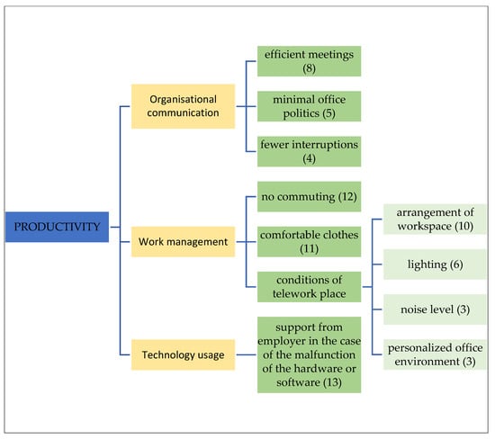 In general, respondents to the study declared themselves satisfied with their productivity during telework. However, a number of 1188 responses were provided for the question related to the reasons why they are not satisfied with their productivity during telework, by those respondents who previously indicated that they feel less productive when teleworking. Based on the results, five extensive categories were mapped and sub-categories underneath the general ones were established to provide even richer detail (Figure 5).