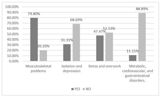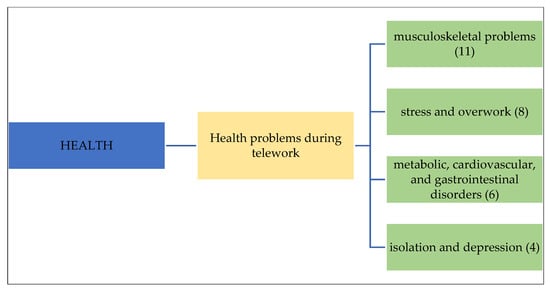 Regarding the overall health condition during telework, 18.85% of respondents, most of them part of Generation Y (80.95%), consider that they have perfect health during telework time. The shares of respondents who consider themselves perfectly healthy were lower in the case of the other generations (Generation X 7.91%, Generation Z 5.25%, Generation Baby Boomer 5.90%). Respondents who scored below 10 for their health self-evaluation, were invited to indicate whether they had health problems due to telework. This construct was based on Tavares’s [] research, previously mentioned within this paper, according to whom health problems associated with telework can be grouped into four categories: musculoskeletal problems, isolation and depression, stress and overwork, and others such as metabolic, cardiovascular, gastrointestinal, or fertility disorders. The results of the qualitative research presented above reconfirmed Tavares’ study.