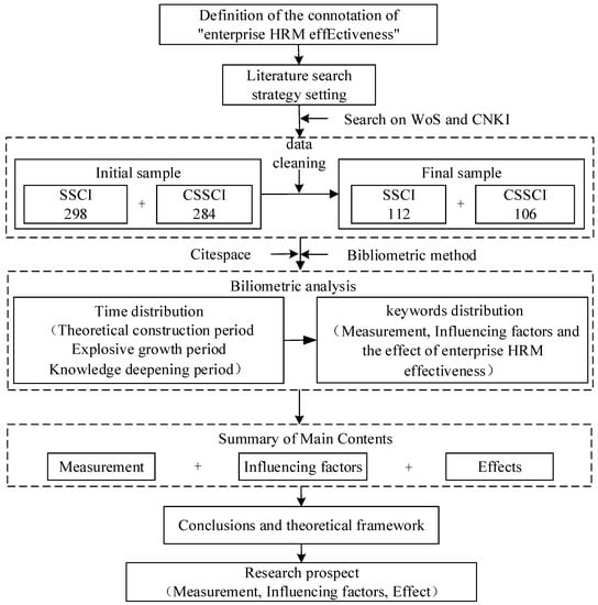 To more systematically present the development trends in disciplinary knowledge and in the main research topics, bibliometrics and a systematic literature review were combined. Bibliometric analysis, as one of the main research methods of scientometrics, uses the knowledge domain as an object to visualize and quantitatively analyze the development process and structure of scientific knowledge and to mine knowledge evolution trends and research hotspots. Tools such as CiteSpace, VOSviewer, SciMAT, and Sci2 are commonly used to assist in knowledge graph analysis. Among them, CiteSpace, with its good visualization and large data analysis capabilities, is a more comprehensive and suitable software for bibliometric analysis [35]. Systematic literature reviews can integrate a large number of broad studies and help to provide a comprehensive diagram of the research topic [36,37]. This study integrates the advantages of the two methods and uses CiteSpace software to explore the research development patterns and hotspots in the field of enterprise HRM effectiveness to systematically, comprehensively, and vividly explain the current state of the art of enterprise HRM effectiveness research. The research flowchart is shown in Figure 1.