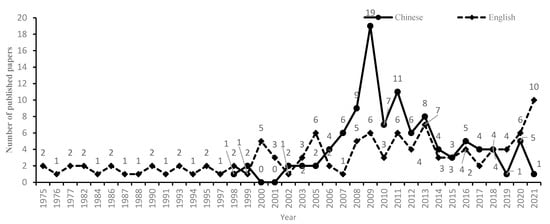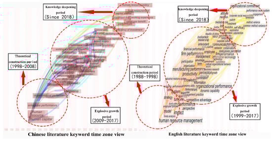 - Explosive growth period (from 1999 to 2017 in foreign countries and from 2009 to 2017 in China). In this period, on the basis of previous theoretical constructions, empirical research methods gradually increased [44,45]. The research mainly focused on the measurement of enterprise HRM effectiveness and the relationship between human efficiency and more detailed internal variables, such as enterprise culture, enterprise strategy, enterprise system, enterprise innovation, social responsibility, and knowledge management. In terms of topics, the English papers have mainly focused on the impact of HRM effectiveness on organizations and employees. Chinese studies focus on the relationship between HRM effectiveness and enterprise factors, and further qualitative research emerged.
