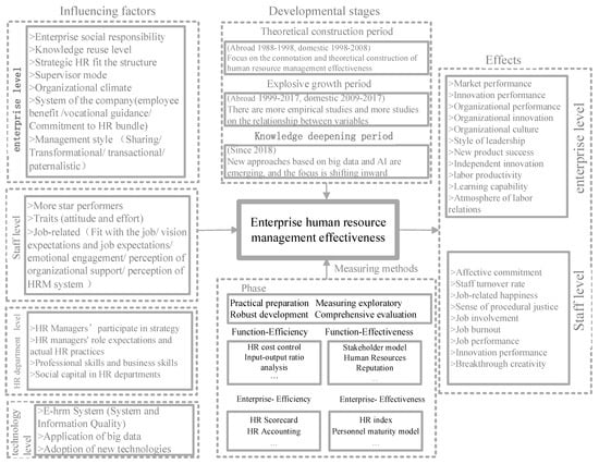 - Factors at the enterprise level. The factors that affect enterprise HRM effectiveness at the enterprise level can be classified as follows: strategy, management, and institutional culture. ① In terms of strategy, research suggests that enterprise human resource strategic engagement and adaptability, as well as the degree of human resource activities, have an impact on enterprise HRM effectiveness. For example, ref. [59] found that a strategic HRM engagement structure has a significant positive effect on enterprise HRM effectiveness. ② In terms of leadership, research suggests that management flexibility, team decision making and procedures, and management style with business executives assuming a participatory role will lead to improvements in enterprise HRM effectiveness. In addition, a management style that respects human nature, with shared leadership, or transactional and transformational leadership can have positive impacts on HRM effectiveness. For example, Sun et al. [60] found that, in different life cycles of enterprises, different leadership styles have impacts on enterprise HRM effectiveness. ③ In terms of institutional culture, studies have found that employee care policies and enterprise culture, such as employee welfare and career guidance, have a positive impact on enterprise HRM effectiveness. For example, Chang [61] noted that there is a positive correlation between commitment to human resources and enterprise HRM effectiveness.