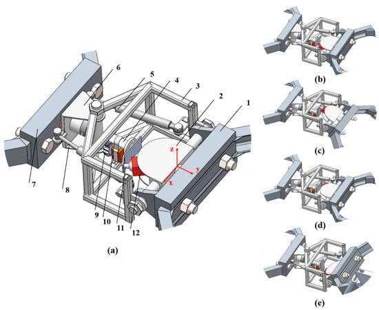 Schematic diagram of three-degree-of-freedom articulated structure: (a) General schematic diagram: (1) front frame, (2) pitch plate, (3) frame, (4) rotary shaft, (5) steering hydraulic cylinder, (6) torsion connector, (7) rear frame, (8) steering hydraulic cylinder, (9) meshing gear, (10) servo motor, (11) ball joint pair, and (12) slider; (b) horizontal position; (c) lift-up limit position; (d) horizontal position; and (e) pitch-down limit position.