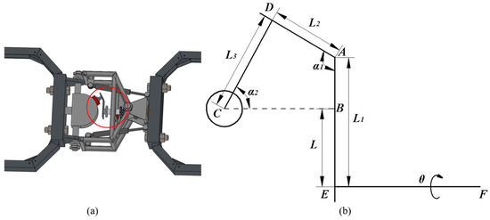 The servo motor drives the gear to rotate, driving the rotary shaft to rotate in the entire circle on the plane perpendicular to the driving direction. The ball joint pair at the end of the rotary shaft is connected to the pitching plate through the slider, and the entire rotation of the rotary shaft is converted into a reciprocating swing of the pitching plate to realize the active pitching of the front and rear frames of the chassis. According to the working principle of the pitching motion of the front and rear frames, the ball joint pair at the end is simplified into a circle, and the other parts are rigid connection structures, which can be simplified into line segments. The structural diagram of the rotary shaft as shown in Figure 3 is established. Rod CD in the figure is the ball joint pair arm, the circular C is the ball joint pair ball head, and rods AD, AE, and EF are the rigid parts of the rotary shaft. According to the geometric relationship of each parameter, the following can be obtained: