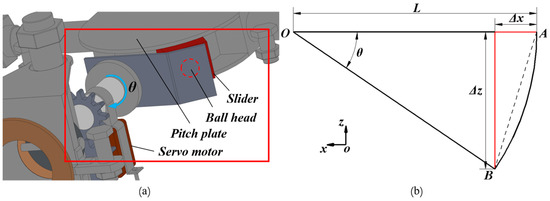 Position diagram of the center point of the ball head at the end of the rotary shaft: (a) Equivalent model described in red; (b) corresponding geometry.