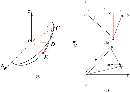 The ball head of the rotary shaft has no linear displacement in the direction of the rotation axis, thus the difference between the y-axis coordinates of points D and E is equal to the corresponding difference between points C and D, as shown in Figure 5c. The square value of DE can be obtained by combining Equations (4) and (5) in the xoy-plane as follows:
