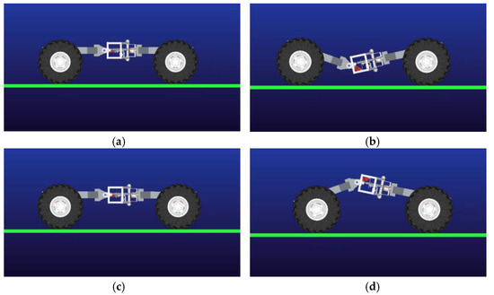The chassis prototype model was established in SolidWorks and imported into ADAMS in Parasolid format. The ground environment was set to simulate the real road conditions, and the constraints and drives of each joint were added according to the actual movement of the chassis. The driving value of the rotary shaft rotation pair was added as 1°/s, and the contact relationship between the wheel and the road was added. The chassis model is shown in Figure 8. The simulation time was set to 360 s, and the number of simulation steps was 360. Figure 9 is a schematic diagram of the active pitch of the front and rear frames, Figure 9a,c is the horizontal position of the front and rear frames, Figure 9b is the pitch-down limit position of the front and rear frames, and Figure 9d is the lift-up limit position of the front and rear frames.