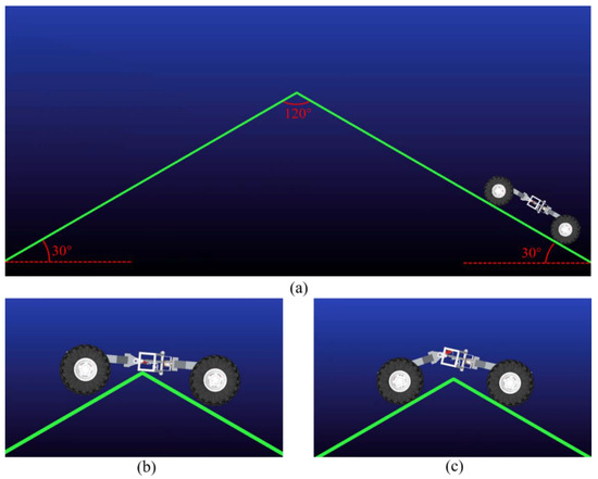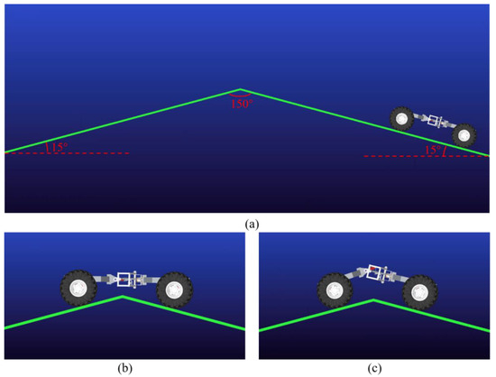 In addition, a slope road with a top angle of 120° (inclination angle of 30°) was established. According to the analysis of the theoretical model of the chassis limit pitch angle established in Section 2.3.3, at this time, ≤ the top angle of the slope ≤ . A simulation model of the chassis climbing over the slope under these conditions was established, as shown in Figure 11. To prevent wheel slippage during chassis driving caused by the increase in the slope inclination angle, the static friction coefficient between wheels and road was set as 0.8, and other parameters remained unchanged.