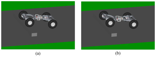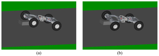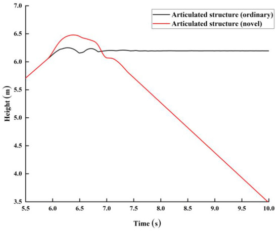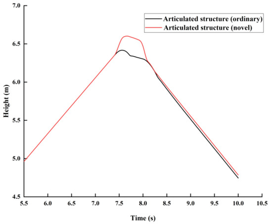 Figure 15 shows the center of gravity (COG) height variation curve of the articulated structure when the chassis passed over a slope with a top angle of 150°. The COG height of the ordinary and the novel chassis increases evenly during the period of 5.5–7.4 s, indicating that this is the climbing stage. The ordinary chassis reached the maximum height at 7.56 s, the height then decreased, and finally the chassis climbed the slope successfully. The novel chassis reached the maximum height at 7.66 s, the height then decreased, and finally the chassis successfully climbed the slope. The simulation results verify the theoretical model results in Section 2.3.3. When the top angle of the slope is greater than the theoretical maximum pitch angle of the chassis (), the chassis can climb over the slope without adjusting the pitch angle.