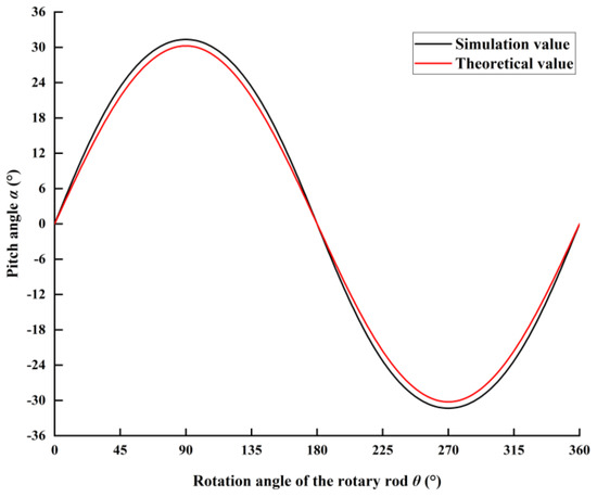 MATLAB was used to analyze the relationship between the theoretical rotation angle of the rotary shaft and the pitching angle of the front and rear frames in Section 2.3.1 and compare it with the experimental data obtained by ADAMS simulation. The curve is shown in Figure 14. The rotation angle of the rotary shaft corresponds to the pitch angle one to one, and the pitch angle is not abrupt. In addition, the theoretical peak pitch angle occurs at the position where the rotation angle of the rotary shaft is 90° and its peak value is 30.24°. The ADAMS simulation results are similar to the theoretical analysis results. The ADAMS virtual simulation peak value is 31.33° and appears at the same position. The theoretical value is consistent with the simulation value, and the maximum error appears at the position where the rotation angle of the rotary shaft is 90°. It is not more than 1%, which verifies the accuracy of the theoretical model.