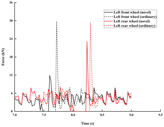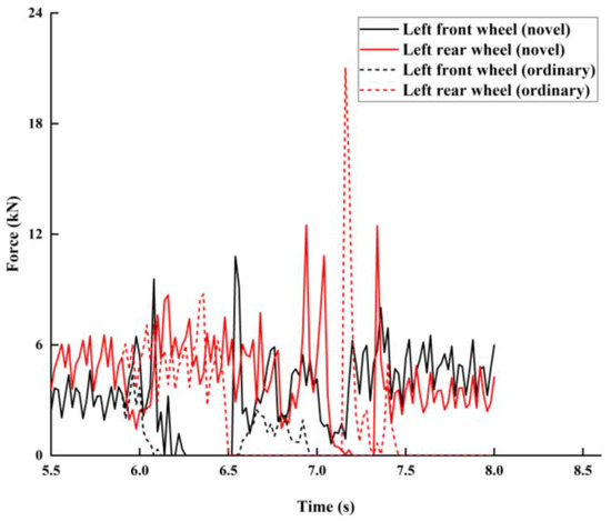 Since the chassis has a symmetric structure and the wheels on both sides have the same contact with the road, only considering the force on the wheels on the left part of the chassis, the wheel force curve when the chassis crosses a slope with a top angle of 150° was obtained, as shown in Figure 16. When the wheel speed of the chassis is 1.39 rev/s and the ordinary chassis runs for 7.44–7.7 s, the force on the left front wheel is 0, indicating that the wheel is separated from the road at this time and the effective driving force is 0. Simultaneously, when the ordinary chassis runs to 7.72 and 8.3 s, the force on the front and rear wheels suddenly increases sharply, affecting the driving stability of the vehicle. When the novel chassis runs for 7.48–7.58 s, the effective driving force of the left front wheel is 0. Under this condition, the duration of the effective driving force of the front wheels of the novel chassis is 61.5% longer than the ordinary chassis, indicating that the road surface traction of the novel chassis is better, and each wheel can provide a sufficient driving force to make the chassis smoothly climb over the slope. The simulation results show that the novel articulated chassis has better road traction and drives more stably than the ordinary chassis.