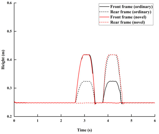 The variation curve of the frame COG height when the chassis climbs over a steep convex obstacle is shown in Figure 19. The COG height of the front frame of the ordinary chassis rises at approximately 2.7 s and remains unchanged for a period of time. Meanwhile, the COG height of the rear frame rises. At approximately 3.4 s, the COG of the front frame returns to the initial position, at which time the front frame completes the obstacle crossing. At approximately 3.8 s, the rear frame starts to cross the obstacle, and the process is similar to the front frame. After 4.6 s, the chassis passes the obstacle smoothly. However, the novel chassis can drive the articulated structure to make the front and rear frames pitch actively, making it possible for the front and rear frames to surmount the obstacle independently. The COG height of the rear (front) frame remains unchanged when the front (rear) frame surmounts the obstacle. Owing to the rigid articulated structure of the ordinary chassis, when the front frame crosses the obstacle, the rear frame has a corresponding lifting height, the wheels and road are not well contacted, and the chassis can easily overturn laterally. However, the novel chassis can cross obstacles independently. When the front (rear) frame crosses an obstacle, the rear (front) frame and the ground are always level, and the wheels have a good contact with the road, improving the lateral stability. The simulation results show that, for a steep convex obstacle, compared with the ordinary chassis, the active pitch function of the novel chassis can ensure that the wheels have a good contact with the road and the load can pass the obstacle smoothly.
