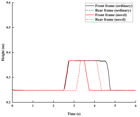 The variation curve of the frame COG height when the chassis climbs over a unilateral obstacle is shown in Figure 21. The COG height of the front and rear frames of the ordinary chassis increases and remains unchanged at 2.6 s and decreases at 4.8 s, indicating that the chassis has completed crossing the obstacles. The front frame of the novel chassis crosses the obstacle at 2.6 s, reaching the peak point at 2.74 s, and the COG height of the front frame remains unchanged until 3.5 s. The rear frame starts to cross the obstacle at 3.1 s and reaches the peak point at 3.34 s. The COG height of the rear frame remains unchanged until 4.1 s, and the chassis crosses the obstacle at 4.4 s. When the novel chassis climbs over a unilateral obstacle, the change law is similar to the steep-convex-obstacle crossing. The front and rear frames cross the obstacles independently. In the unilateral-obstacle crossing of the ordinary chassis, the COG height variations of the front and rear frames are the same since the chassis has no longitudinal torsional degree-of-freedom along the body. In addition, under the same simulation environment, the unilateral-obstacle-crossing time of the novel chassis is shorter than the ordinary chassis, indicating that the ordinary chassis has a high wheel idling rate and insufficient driving force. The simulation results show that, compared with the ordinary chassis, the novel chassis has good road traction when encountering unilateral obstacles, ensuring that the chassis can pass unilateral obstacles successfully.