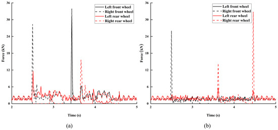 Force curves of wheels of unilateral-obstacle crossing: (a) Ordinary chassis; (b) novel chassis.