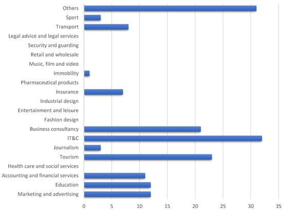 The companies that participated in the research came from different fields of activity, varying both in terms of financial criteria and in terms of the number of employees (or annual turnover). In this context, we found 13 marketing companies, 12 companies whose main activity is education, 11 accounting companies, 23 tourism companies, 3 journalistic companies, 32 ITC companies, and 21 consulting companies. Additionally, 7 insurance companies, one real estate company, 8 transport companies, 3 sports companies, and 31 companies from other fields than those specified in the survey participated in this study. Thus, in Figure 2, the field of activity of each company participating in this study is specified.