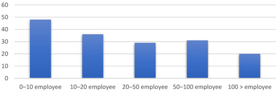 Most of the companies included in the survey operate on a small scale—48 companies had up to 10 employees, and 36 companies had a number of employees between 10 and 20. In addition, 29 companies had between 20 and 50 employees, 31 companies had between 50 and 100 employees, and 20 companies operated on a large scale with more than 100 employees. Figure 3 shows the number of employees the companies have.