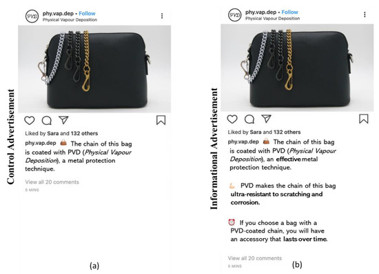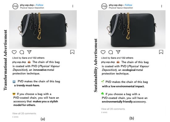 The main aim of our paper was to compare the effectiveness of informational, transformational, and sustainability appeals in increasing the intention to purchase sustainable fashion products, compared to a control. We exposed consumers to a social media advertisement promoting a bag prototype with a chain coated with PVD (i.e., physical vapor deposition) technology. While participants in the control condition only read appeals describing the PVD technology, participants in the informational, transformational, or sustainability conditions read appeals that also focused on the different qualities of the PVD technology (e.g., increased resistance and durability of the product coated with it, novelty in the world of fashion, low environmental impact).