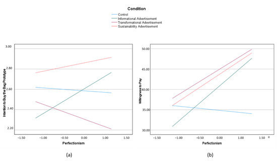 Consumers’ intention (a) and willingness to pay (b) for the bag prototype at different levels of perfectionism.