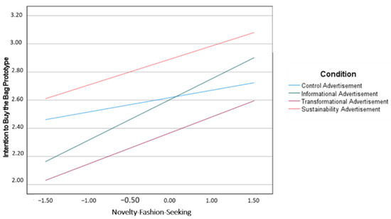 As in the case of perfectionist consumers, the more novelty-fashion-seeking consumers were, the more they intended to buy the bag when exposed to the informational advertisement (B = 0.21; 95% CI = 0.01, 0.33; Figure 4). In addition, the more they perceived the informational advertisement as involving, the more they intended to buy the bag (Ind. Effect = 0.08; 95% CI = 0.01, 0.16; Table 6) and wanted to pay for the bag (Ind. Effect = 2.11; 95% CI = 0.36, 4.28; Table 6). However, the persuasiveness of the transformational and sustainability advertisements did not vary according to the consumers’ level of novelty-fashion consciousness. Therefore, we did not confirm our H2.