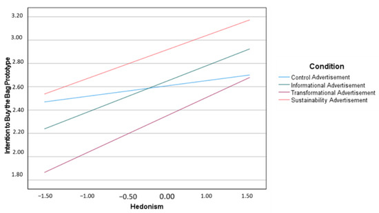 The effectiveness of the transformational advertisement varied as a function of hedonic decision-making style (B = 0.20; 95% CI = 0.04, 0.37). That is, consumers with a low level of hedonism had a lower intention to buy the bag when exposed to the transformational advertisement compared to the other advertisements. However, consumers with a high level of hedonism did not prefer the transformational advertisement; thus, our H3 was not supported (Figure 5). Concerning participants in the informational advertisement condition, the more hedonic they were, the more they perceived the informational advertisement as involving and, in turn, intended to buy and pay for the bag more. Regarding the transformational and sustainability advertisements, message involvement and systematic processing did not differently impact consumers’ intention and willingness to pay as a function of the consumers’ level of hedonism. All results of these moderated mediation analyses are reported in Table 7.