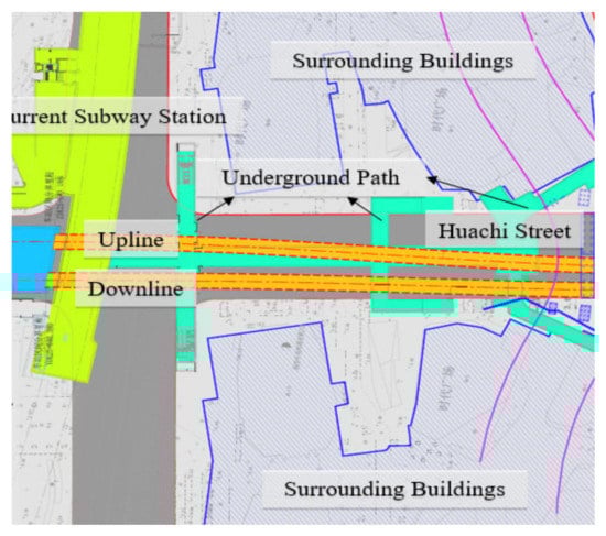 The new subway line station in Suzhou City is a transfer station along with two subterranean stations that are built as part of the underground tunnel laying, as indicated in Figure 1. The station structural outsourcing measures 169.5 m in total length, 20.264 m in width for the regular portion, and 24.264 m for the expansion section. The route runs straight through the current subway station. The current station is a 1000 m radius curving one on the second underground floor. They are not orthogonal. A bustling business district surrounds the new station, which is next to a construction-intensive zone. The upline of the shield is unable to avoid the plane’s current underground path due to the overall section’s environmental limitations. In terms of plane distance, Huachi Street is 1.5 m distance from the upline shield tunnel and 2.3 m away from the downline shield tunnel.