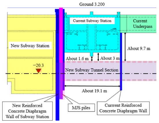 The new tunnel is only 1.6 m away from the existing station floor. In the shield crossing range under the existing station, the horizontal MJS full hall reinforcement is adopted from the end of the station. The shield section conflicts with the 0.6 m thickness wall of the existing station at the undercrossing existing line, as shown in Figure 2. The structure of the diaphragm wall is the composite wall, the joint form is the locking pipe, the concrete strength grade is C 30, and the steel bar is an HRB 335 steel bar with a diameter of 25 mm. The existing station floor is set in a silty sand silty soil layer, and the floor of the new shield tunnel is mainly in a silty sand silty soil layer, a silty clay layer, and a clay layer. The reinforced concrete diaphragm wall on the south side has the plan to adopt the method of direct crossing of the shield grinding wall.