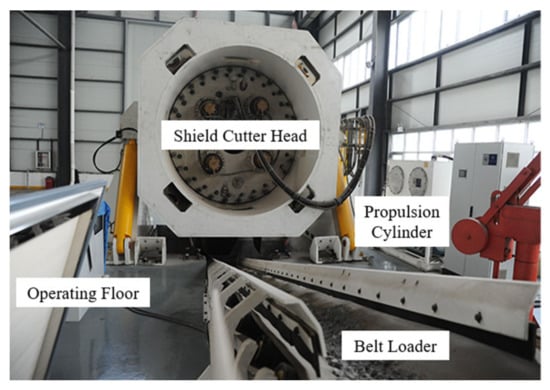 The TBM mode driving test bench was used to cut the reinforced concrete diaphragm wall. The size of the test bench was 6880 × 4050 × 5176 mm, the diameter of the cutterhead was 2280 mm, and the equipment torque was 250 kN·m. The cutterhead panel can be installed with three central double disc cutters and eight single disc cutters, and the cutter spacing can be adjusted within the range of 80~100 mm. The test beach can work both horizontally (Figure 3) and vertically.