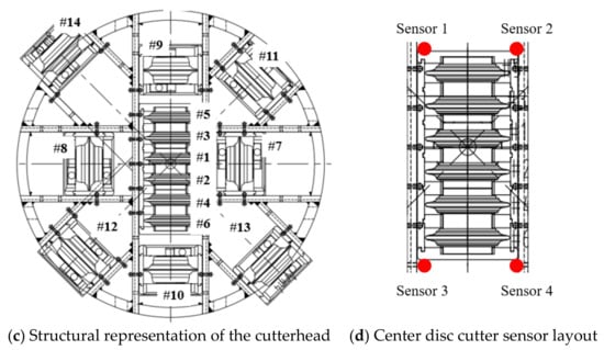 A total of 14 disc cutters with diameters of 432 mm were used in this test, among which cutters No.1 to No.6 were three center double disc cutters with cutter spacings of 84 mm, and cutters No.1 to No.6 were single-disc ones with 100 mm cutter spacing. Each cutter was equipped with wireless sensors for real-time monitoring of each cutter’s typical force. Four sensors were set in each of the No.1 to No.6 center disc cutters, whereas for No.7 to No.14, cutter sensors were set separately. Figure 4 shows the layout of the test cutter, cutterhead configuration, and center disc cutter sensor.