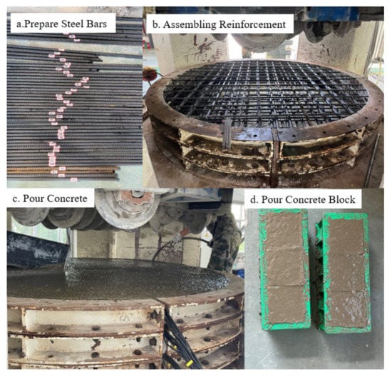 Two layers of reinforced concrete were poured into the rock box mold of the test bench for full disc cutter cutting, and the steel bars were welded on the inner wall of the rock box mold. Each layer of steel mesh consisted of two layers of steel bars with different diameters, in which the transverse steel bars of the steel mesh were set above, and the longitudinal steel bars were below. The transverse steel bar adopted 12 HRB 335 steel bars with diameters of 16 mm and spaces of 200 mm. The longitudinal reinforcement was made up of 16 HRB 335 steel bars with diameters of 25 mm and spaces of 150 mm. C45 concrete was supposed to be poured after the steel mesh was welded. The sample preparation process is shown in Figure 5. The concrete block was retained for compressive test, and the excavation test was conducted after the concrete structure maintenance met the strength requirements.