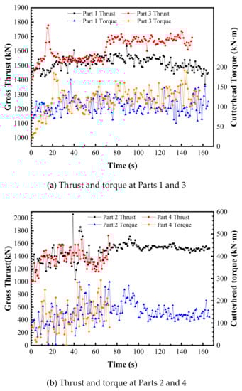 The driving parameters of the cutterhead under different working situations are shown in Table 3. The cutterhead speed was kept constant during the tunneling experiment, while the driving speed was changed by input from thrust and torque. As a result, throughout the experiment, the penetration depth changed in real time rather than being a set value. This variation in penetration depth rate with driving speed was referred to as feedback penetration value. The real-time curve of the thrust and torque of the cutterhead under different working situations of Part 1 and Part 3 and Part 2 and Part 4 is shown in Figure 6.