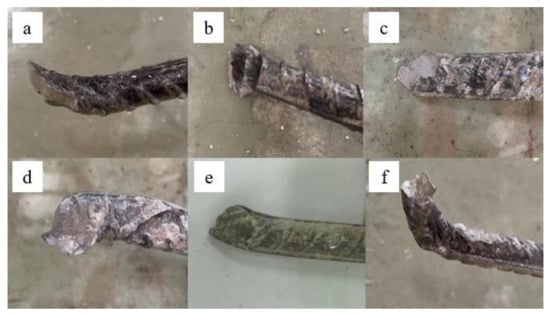According to the analysis of the collected steel bar fracture form, the steel bar fracture can be divided into three types, as shown in Figure 7. The first type is single-sided rolling damage (Figure 7a–c). The surface of the Section a fracture was smooth, namely, a “V” shape section formed by the steel bars fixed at both ends, well constrained with concrete after multiple rolling by disc cutters. The term “reinforcement constraint” refers to both the restriction at the reinforcement’s ends and the constraint behind it. The steel bar was pushed by the disc cutter at various angles, and the side was repeatedly sliced until the steel bar broke. The fracture was the most ideal one for disc cutter cutting steel bars. This type also fully displays that it is feasible for a disc cutter to cut steel bars, namely, as long as the steel bars are well constrained, the disc cutter can cut the steel bars smoothly. Section b had thin and flat warping with obvious marks of being rolled by the disc cutter. With the increase in the cutting depth of the disc cutter, the remaining thinned part of the steel bar after rolling was fractured by brittle bending at one time. Section c was a stepped slope with rolling marks and a certain thickness. This fracture was formed by the fracture of the disc cutter after being rolled in the same direction, and brittle fracture occurred when the disc cutter was rolled to nearly half of the steel bar. For the formation of the first type of fracture, what steel actually requires is great boundary constraints.