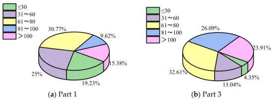 Table 4 and Figure 8 show that the ratio of Part 1 to the total number of steel bars with a length of less than 60 cm was 44.2%, and the ratio of Part 3 to the whole number of bars was 17.4%. The ratio of Part 1 to the total number of steel bars with a length larger than 100 cm was 15.4%, and the ratio of Part 3 to the whole number of bars was 23.9%. In both situations, the maximum percentage of steel bar length was 61 to 80 cm.