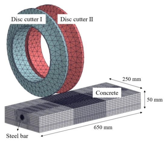A fully functional explicit dynamic analysis finite element software ANSYS/LS-DYNA was used to establish a three-dimensional linear cutting model of reinforced concrete members and disc cutters, as shown in Figure 9. Reinforcement and concrete were modeled by the common node method, and solid hexahedral elements were used. The concrete material was the No. 272 RHT model, and the steel bar was made of No.3 *MAT-PLASTIC-KINEMATIC. The diameter of the cutter was 432 mm, and the blade width was 14 mm. Without considering the wear of the disc cutter, the knife ring was set as a rigid body, and the solid tetrahedral unit was adopted. The main parameters of model materials are shown in Table 5. Considering the size effect of the structure, the simulation results show that when the model size of the reinforced concrete member was 650 × 250 × 50 mm, the average cutting force difference of the disc cutter compared with the previous size was less than 5%, which was considered to be less affected by the model size. The diameter of the steel bar was 25 mm. The thickness of concrete cower from the reinforcement bar was 15 mm. The mesh of the reinforced concrete layer was encrypted, and the total grid number of the model was 84,657.
