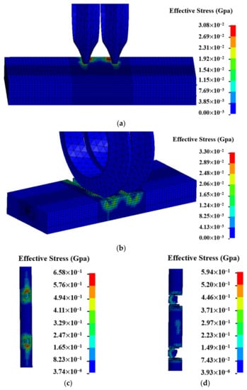 Simulation of reinforced concrete structure breaking by two disc cutters. (a) effective stress when concrete is cut firstly; (b) effective stress during the stage of stable cutting; (c) effective stress when the steel bar is cut firstly; (d) effective stress when the steel bar is about to break.
