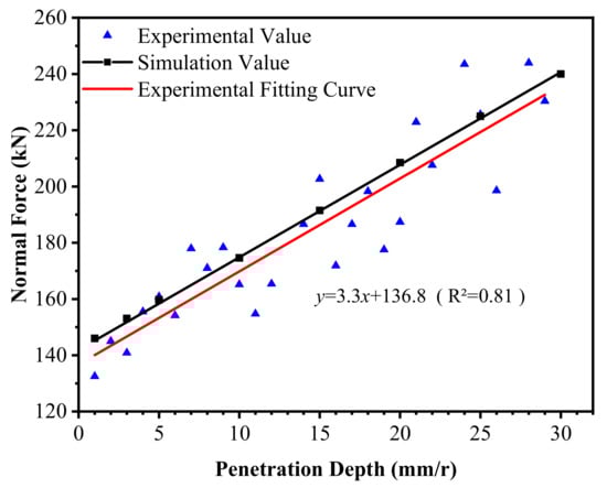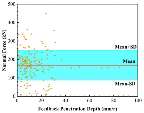 The normal force of the test disc cutter in Part 2 of the test was taken as the same as that in the simulation for comparative analysis. Figure 11 depicts the normal force scatter diagram that corresponded to the real-time penetration depth feedback value during the test disc cutter’s cutting process. In order to make the data more effective, the mean and standard deviation control charts were introduced to discharge the sensor abnormal data. According to the data points in the (Mean + Standard deviation–Mean-Standard deviation) range, the test disc cutter penetration depth feedback value was primarily concentrated near 30 mm/r, as indicated in the blue area of Figure 12.