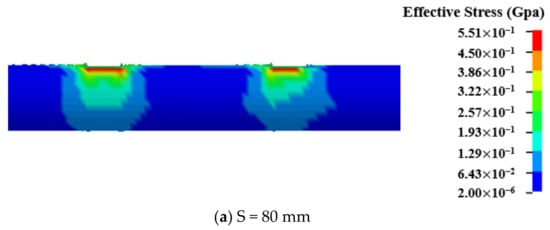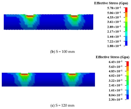 For practical engineering, the cutter spacing is generally between 80 and 120 mm. In the case of the same penetration depth (P= 5 mm/r), three cutter spacings of 80 mm, 100 mm, and 120 mm were numerically simulated. The effective stress of one-time cutting of a steel bar under different cutter spacings is shown in Figure 13. The results show that the equivalent stress zones caused by the two disc cutters were relatively independent, and the equivalent stress of the steel bar was mainly located in the vertical direction with little difference in stress values. Therefore, the cutter spacing had little effect on the cutting length of the steel bar. For the whole disc cutter cutting reinforced concrete structure, the cutter spacing should be comprehensively determined by the cutter box size, the disc cutter size, and the cutterhead structure.