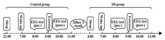 Based on the American Sleep Foundation’s recommendations for the amount of sleep at night for young people aged 18–25 years (2015) [10], sleep duration < 4 h is considered severe sleep deprivation, 4 h ≤ sleep duration < 6 h is considered mild sleep deprivation, and sleep duration ≥7 h is considered normal sleep. The operational details of the sleep-deprivation model developed in this experiment were as follows: (1) 30 participants were guaranteed to have slept well and not to have accumulated somatic and mental fatigue before the modeling; (2) at 10:00 pm on the day before the exercise, a sleep detector (GT9X-BT, ActiLife, Pensacola, FL, USA) was worn and the sleep time, intensity and duration of physical activity were recorded for 24 h. The acquisition frequency was 1000 Hz; (3) The participants rested in the laboratory before the test until 3:00 a.m. and were awakened before 7:00 a.m. to ensure that the actual sleep time was <4 h. The participants were considered to be the sleep-deprivation group; (4) The control group was still the same group of subjects, with the sleep time at 10:00 p.m. and the awakening time at 7:00 a.m. to ensure that the sleep time was 7:00 a.m. The actual sleep time was guaranteed to be ≥7 h.