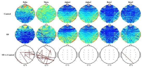 Pre-exercise network distribution of two groups of adolescents (control group; SD: sleep-deprivation group; SD vs. control: difference between the two groups). Note: ↑ indicates increase, ↓ indicates decrease, ‒ indicates insignificant change, *: p < 0.05.