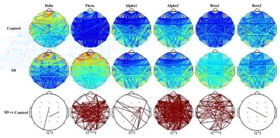 As the results in Figure 3 and Figure 4 show, before exercise, brain functional connectivity in the central and right temporal regions of the Delta band was significantly lower in the sleep-deprived group compared to the control group (p < 0.05); there was significantly lower functional brain connectivity in the parietal and occipital regions in the Theta band (p < 0.05); and functional brain connectivity was significantly elevated in the left temporal and right parietal regions (FT7-O2) in the Beta2 band (p < 0.05).