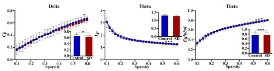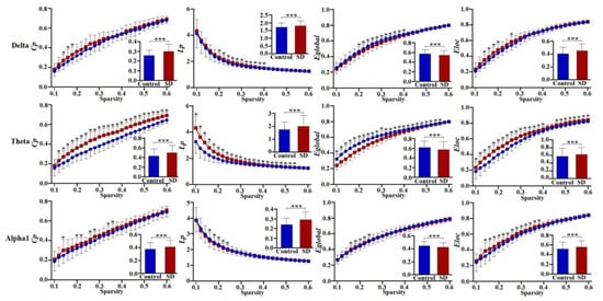 As shown in Figure 5 and Figure 6, at a particular level of sparsity, the clustering coefficients in the Delta band were significantly lower in the pre-exercise sleep-deprivation group compared to the control group (p < 0.05); the characteristic path length and global efficiency were significantly lower in the Theta band (p < 0.05 and 0.001). In the Delta and Theta bands in the post-exercise sleep-deprivation group, clustering coefficients, characteristic path lengths, and local efficiencies were significantly higher (p < 0.001) and global efficiencies were significantly lower (p < 0.001). The clustering coefficient and local efficiency were significantly higher (p < 0.001) and the feature path length and global efficiency were significantly lower in the Alpha1 band (p < 0.001).