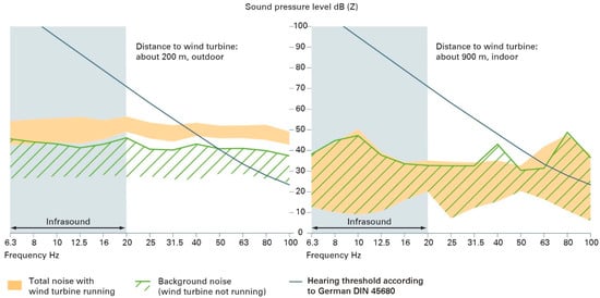 Sound emittance from wind turbines is not easy to measure, especially at longer distances, as the measured noise levels are influenced/altered by environmental conditions and other sounds. However, some instructive data are available from an extensive government-commissioned project in Finland. One part relates to indoor sound measurements conducted near two wind turbine locations [66]. The results were clear; the unweighted equivalent continuous sound pressure levels in houses near wind powerplants were about 20 dB higher than in previous long-term measurements in natural areas (distance to wind parks was about 1.5 km, but parks were considerable, with 17 wind turbines) [66]. According to the equivalent continuous sound pressure levels, the most important frequencies were less than 1 Hz and frequencies below 2 Hz if the highest equivalent levels are considered, with values as high as LZ, max = 93 dB and LZ, max = 97 dB in the two locations, respectively [66], for full detail.