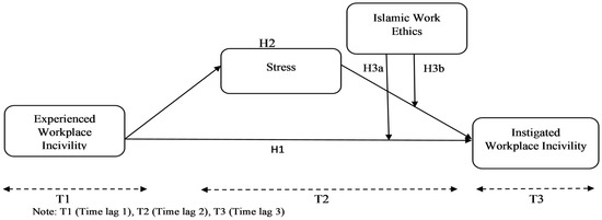The research methodology used was the one used by [24,61,62] in a similar sector with similar study objectives. Based on the objective and philosophical construct of the study, the respondents were Muslims and only those individuals were selected for the purpose of data collection who had at least one year of work experience. Moreover, the participants were ensured that their responses would be kept confidential. Data were collected at three-time lags by keeping the ten days gap in each interval of time as used by Qasim et al. [63]. Demographic characteristics data were collected at Time 1 (T1) which includes age, gender, education, and work experience designation along with experienced workplace incivility. Data for the mediator stress and moderator Islamic work ethics were collected at Time 2 (T2) with a gap of 10 days. Lastly, data for instigated workplace incivility was collected at Time 3 (T3) after a gap of ten days from T2.