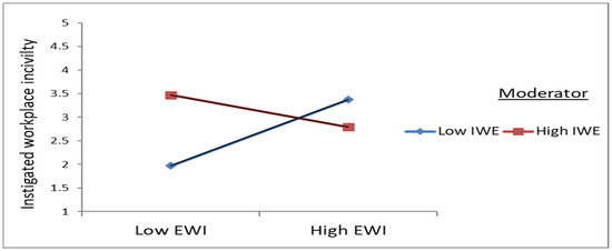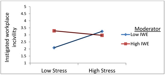 Table 7 also shows the moderation effect of IWE between stress and EWI. Our results proved that the Stress × IWE interaction term was significant (β = −0.37, p < 0.01), thereby providing support for hypothesis 3b. The interaction term graph in Figure 3 proved that the positive relationship between stress and IWI was weaker for higher levels of IWE (β = −0.21, p < 0.05) compared to the lower levels of IWE (β = 0.03, p < 0.05), reiterating the argument in support of Hypothesis 3b that IWE moderates the negative relationship between stress—IWI.