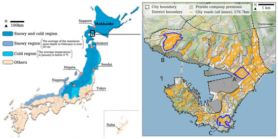 Regarding geography, the city has an area of 80.65 km2, which covers 98 administrative districts. This study analyzed all the roads, excluding port and industry premises. The number of surveyed areas was 89. In addition, we visualized the results for three zones: Nakajima-Cho (city center; District A); Hakuchodai-Cho (a large and modern residential area; District B); and Bokoi-Cho (an old residential area; District C), to reveal the relationship between outcomes and urban structure. Of these three districts, Districts B and C are located in the highland, while District A is located in the lowland and flat areas.