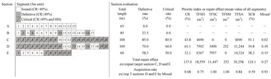 Regarding the third research question, we introduced the repair effect ratio as the benchmark score to assess the maintenance plan. This score is the ratio of the sum of the repair effect indexes of the selected sections divided by the total repair effect index of all repair target sections. For example, Figure 4 exhibits the repair effect ratio or acquisition rate when selecting Sections D and E for repair (last row).
