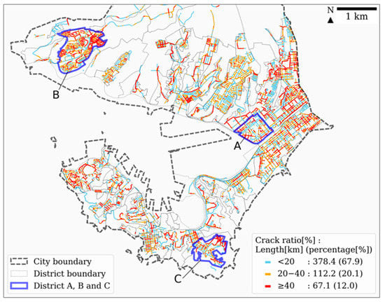 Table 1 summarizes the pavement crack ratios for the city’s network and Districts A, B, and C. As the results express, the defective segment lengths for Districts A, B, and C were 2.7 km, 9.4 km, and 3.3 km, respectively. Though District B is a new residential area, its road damage level was higher than in Districts A and C.