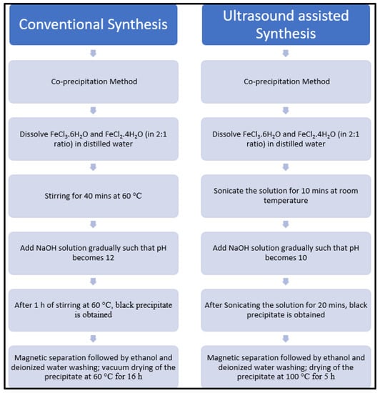 Stepwise methodology for the synthesis of magnetic Fe3O4 nanoparticles using conventional and ultrasound-assisted synthesis methods.