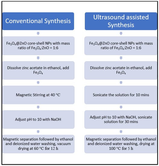 Stepwise methodology for the synthesis of Fe3O4@ZnO ‘core-shell’ nanoparticles using conventional and ultrasound-assisted synthesis methods.